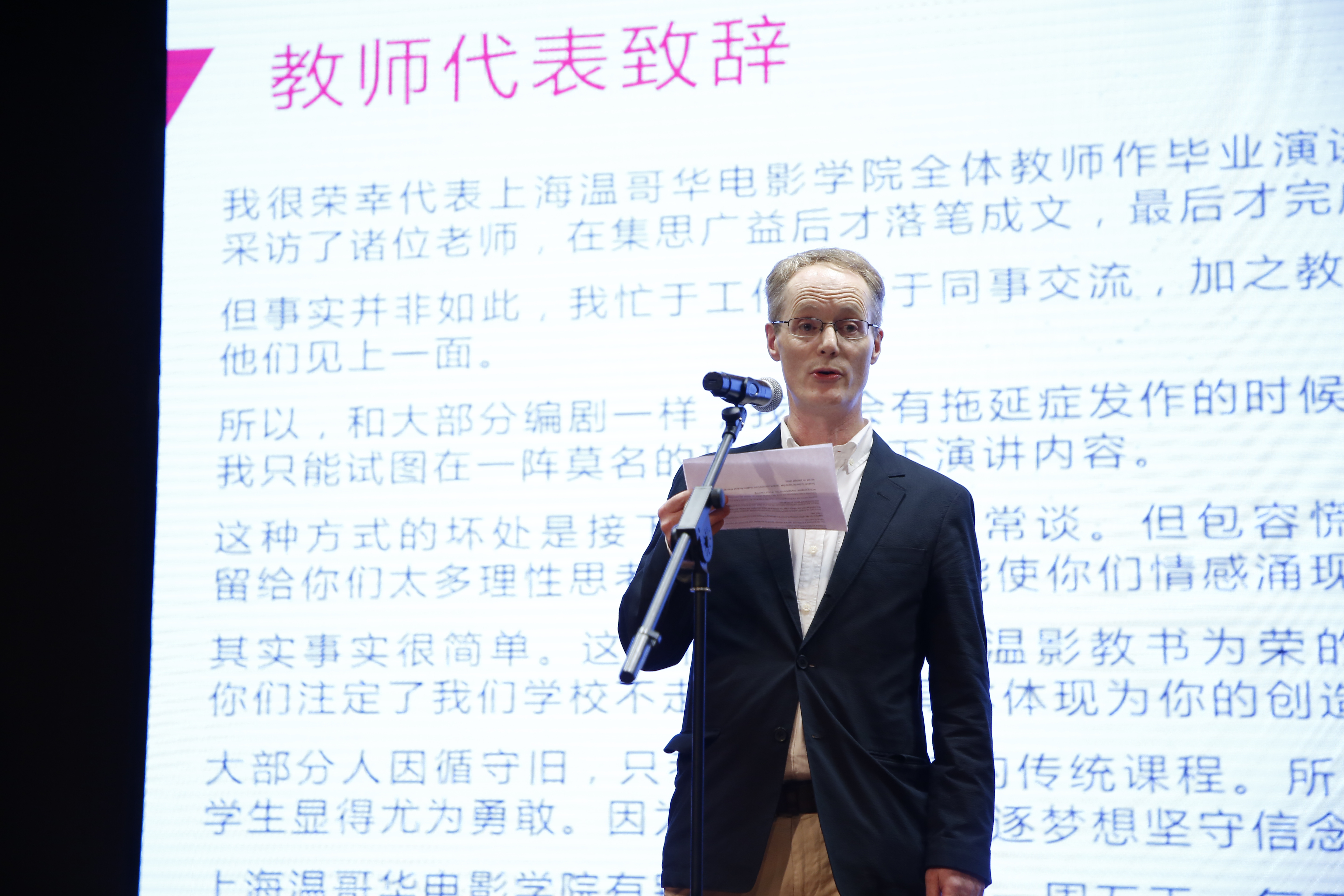 “在上海温哥华电影学院任教的十年里,我的手机里存着上千张白板的照片。没有风景,没有人像,只有白板。每一块斑驳反光里潦草的字迹,都是一个学生的故事……对我而言,在这里的岁月,是用白板、可擦马克笔和学生们的故事来丈量的。”这段摘自伯恩斯先生于学院十周年之际所写文章《白板人生》的文字,正是其教育理念的生动写照。他治学严谨而热忱,课堂深入浅出,始终以激发每一位学生的创造力为使命。在学院任教期间,他累计培养千余名中外毕业生,其学生作品在上海国际电影节、塔林黑夜电影节等海内外重要平台屡获佳绩,更成功入围奥斯卡金像奖、英国电影学院奖等国际奖项的评选。众多毕业生已成为海内外影视行业的中坚力量,其专业精神与创作火种,正是伯恩斯先生育人成果最生动的延续。