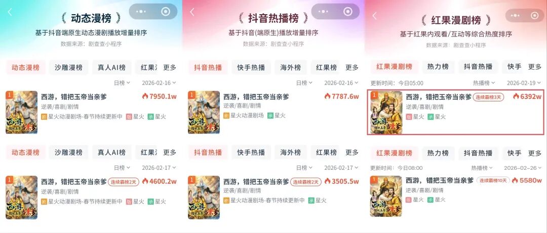 赛道空前火热,但什么样的创作者能真正脱颖而出?答案藏在爆款里。今年春节,漫剧《西游:错把玉帝当亲爹》结合经典IP与创新叙事,上线35小时,抖音播放量破亿,红果热度冲至6392万,创下漫剧纪录,被媒体称为“漫剧版哪吒”。该剧虽然脱胎于国民IP《西游》的故事,但其实是一个星火动漫的原创剧本。其故事没有重复去讲那些我们已经耳熟能详的经典桥段,而是巧妙地借用《西游记》的世界观和角色,通过一系列颠覆性改变,创造了一个全新的“西游平行宇宙”,再次印证了好故事的力量:真正抓住观众、定义爆款的,永远是优质的故事内核与专业的叙事能力。