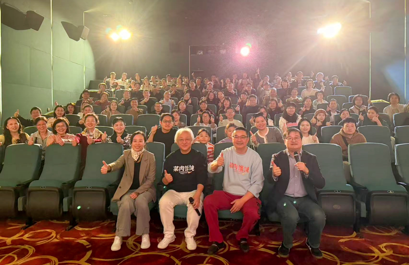 影片独特的海派魅力,收获了观众最直接的反馈。随后的观众分享,将现场气氛推向高潮。来自温影的学子,以“编剧思维”分析了影片的结构与人物塑造,认为其在平淡中见真章,展现了高超的叙事技巧。一位特意携父母前来观影的影迷朋友激动地表示:“这部电影我非常喜欢,它深深触动了我。今天,我也正是在身体力行地践行电影中所倡导的对父母的陪伴。我的父母时隔多年再次走进影院,他们同样非常享受这部电影,这让我感到无比欣慰。”另一位青年观众则分享了她全程“笑泪交替”的观影体验:“我很激动,也很高兴能在影院看到这样一部有温度的影片。观影过程对我来说,不仅是一次艺术享受,更是一次自我疗愈的心灵旅程。”来自上海市中小学校长艺术素养提升研修班影视板块的校园长们,也从教育工作者视角给予了影片高度评价。她们分享道,《菜肉馄饨》不仅艺术地再现了海派文化的魅力,更在潜移默化中向年轻一代展现了社会“老有所乐”的美好图景,影片中所蕴含的家庭伦理与代际沟通智慧,对当下的青年群体具有非常积极的教育和引导意义,也凸显了优秀文艺作品在美育和德育方面的社会价值。