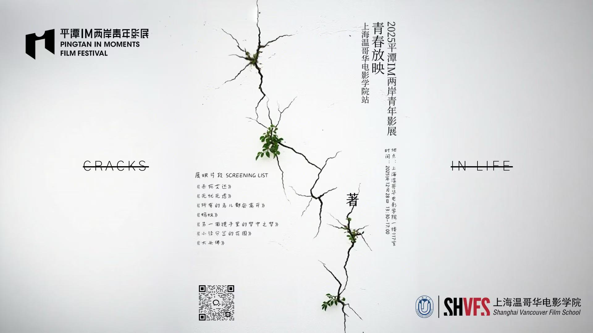 12月28日,上海温哥华电影学院与平潭IM两岸青年影展联合举办的2025年度“青春放映”活动在学院顺利举行。本次展映以“生活的裂隙”为主题,集中呈现七部入围平潭IM两岸青年影展的优秀短片《杀死艾达》《所有的鸟儿都会离开》《蚂蚁》《另一面镜子里的梦中之梦》《小径分岔的花园》《无忧无虑》《大头佛》。映后,《大头佛》导演柯志杰、主演蓝蓓蓓、《无忧无虑》摄影指导、温影电影制作专业讲师曹丹滢与到场师生、影迷观众围绕短片创作背后的思考、拍摄挑战与艺术表达进行了真诚分享。活动由上海温哥华电影学院副院长陈晓达主持。