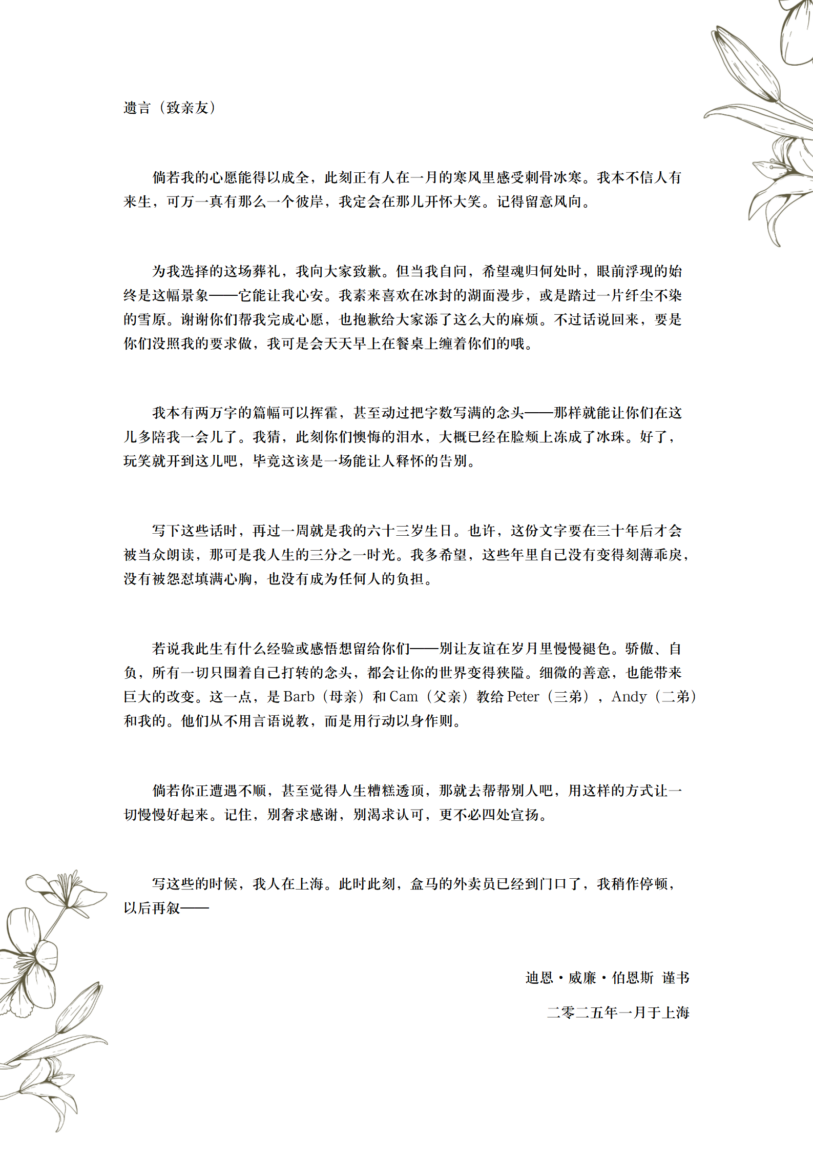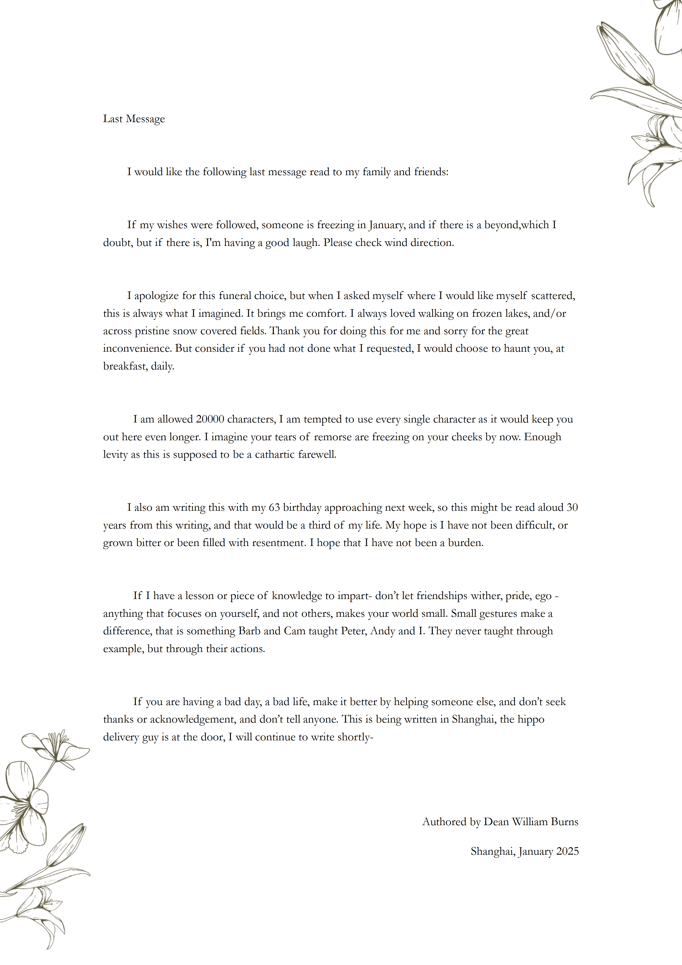 迪恩·威廉·伯恩斯(Dean William Burns)先生文字遗言全文